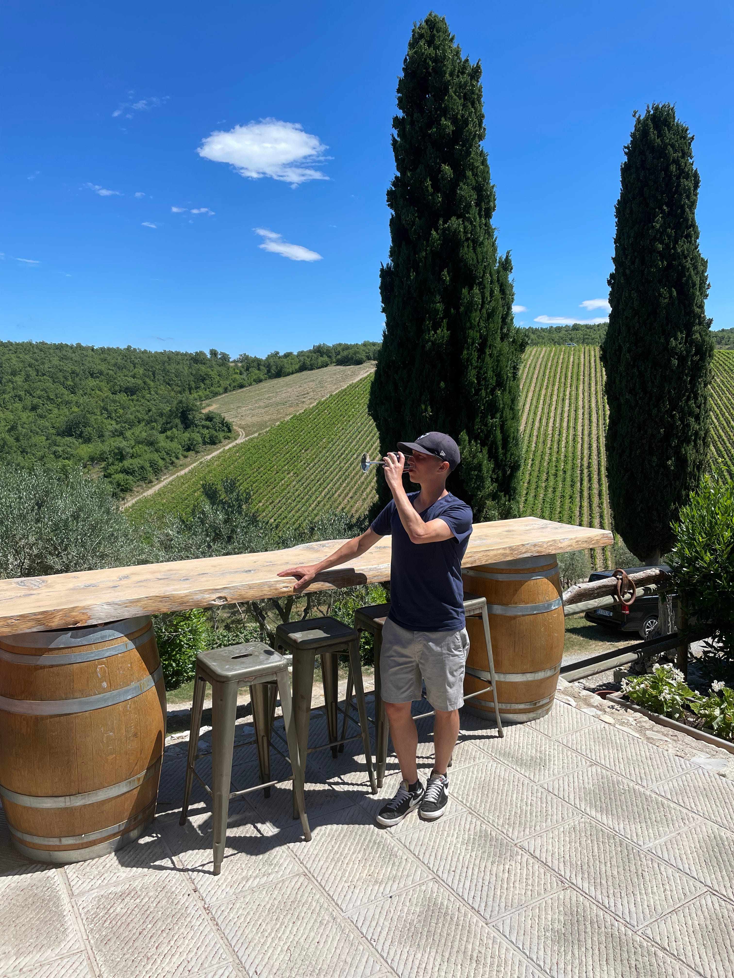 With the next wedding event not scheduled until Friday night, Lynn and I had scheduled (by recommendation from friends in NYC) a private wine tour through northern Tuscany. Around 10am Friday, we were picked up by our guy Stefano, a sommelier who started his own tour company. He drove us through the hills of Tuscany, about 50 minutes to our first stop: a small, family-owned winery that also grew olives, and garlic, produced a dozen wines, 30-year-aged balsamic vinegar, olive oil, and other specialties. The tour guide at the winery was awesome, answered all our (my) questions, and ensured we left full and buzzing.