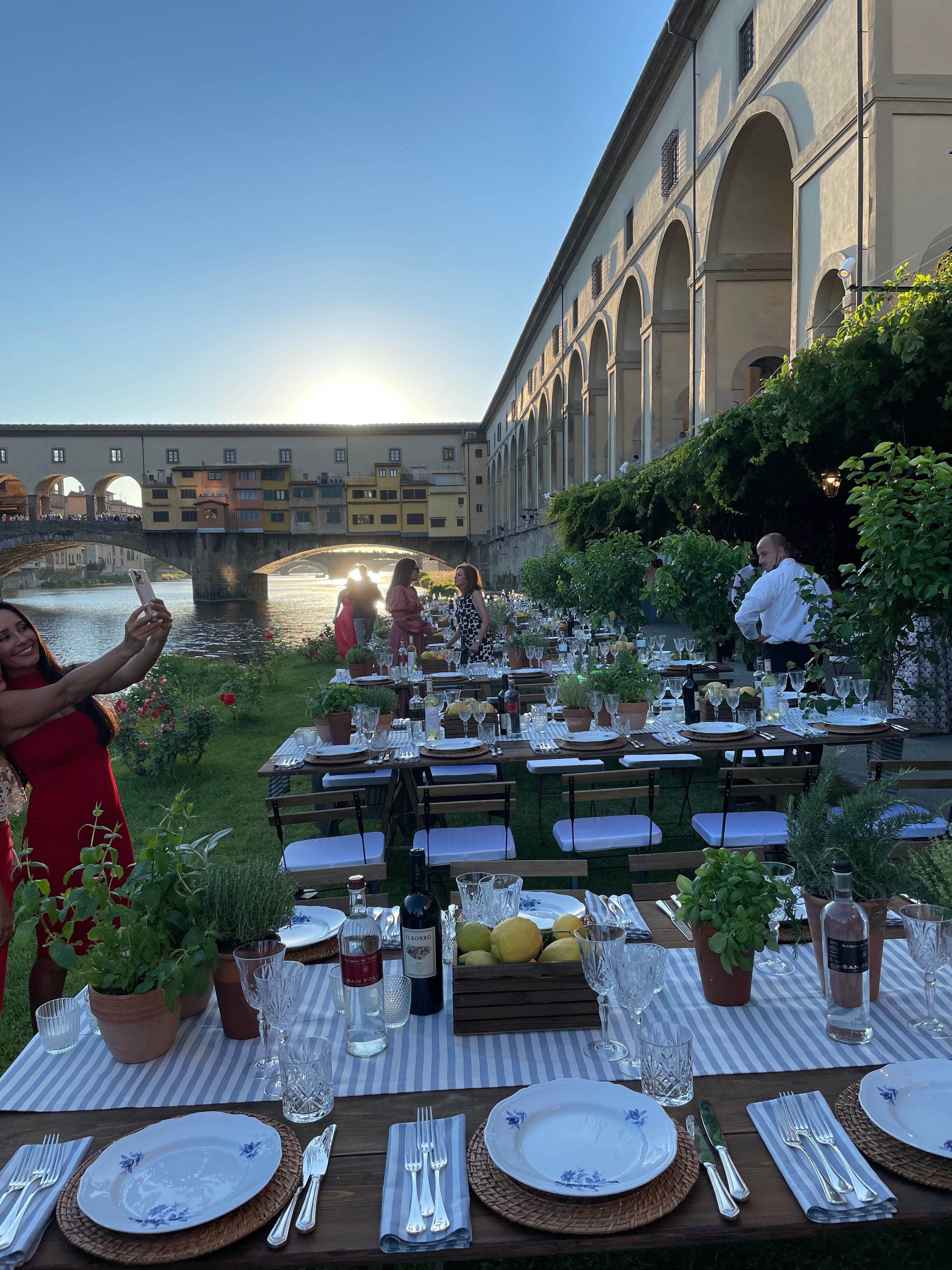 We were dropped back at the hotel around 4pm, and it was time to get dressed for the official “rehearsal dinner”. I put it in quotations because it wasn’t one of those situations where the rehearsal is limited to close friends and family, or to people from out of town. Instead, everyone with an invite to the wedding was welcome to this insane dinner setup right on the bank of the Arno river running right through central Florence. While the walking paths along the river are raised up high at the street level (~5 metres above the water), there is one spot on the bank, underneath a famous museum, that has a beautiful grassy piece of land carved out specifically for events.